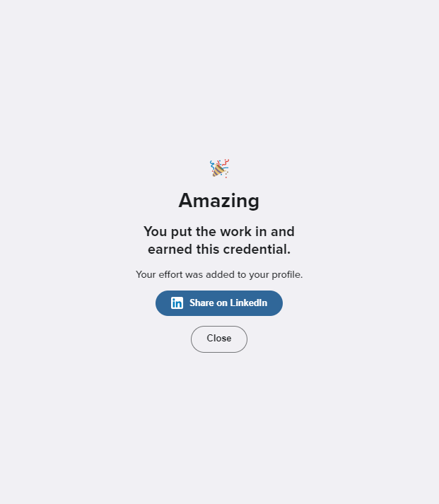 Share to LinkedIn: Upon completion of a 'Credential' training item, students will have the option to share their success to Linked In. This will add a credential item to their profile, while also giving them the option to share a post to their Profile Activity feed. Note: this feature is not currently available for Courses or Certifications.
