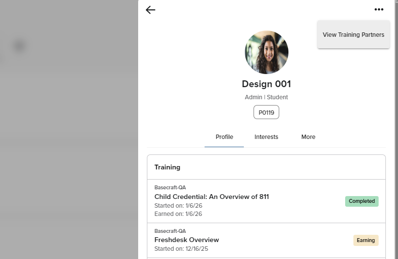 View a students list of Training Partners: When viewing a students profile, select the 3-dot options menu at the top-right of their profile panel to view a list of all training partners (Irth Training Clients) that student is associated with. This is view-only information at this time.