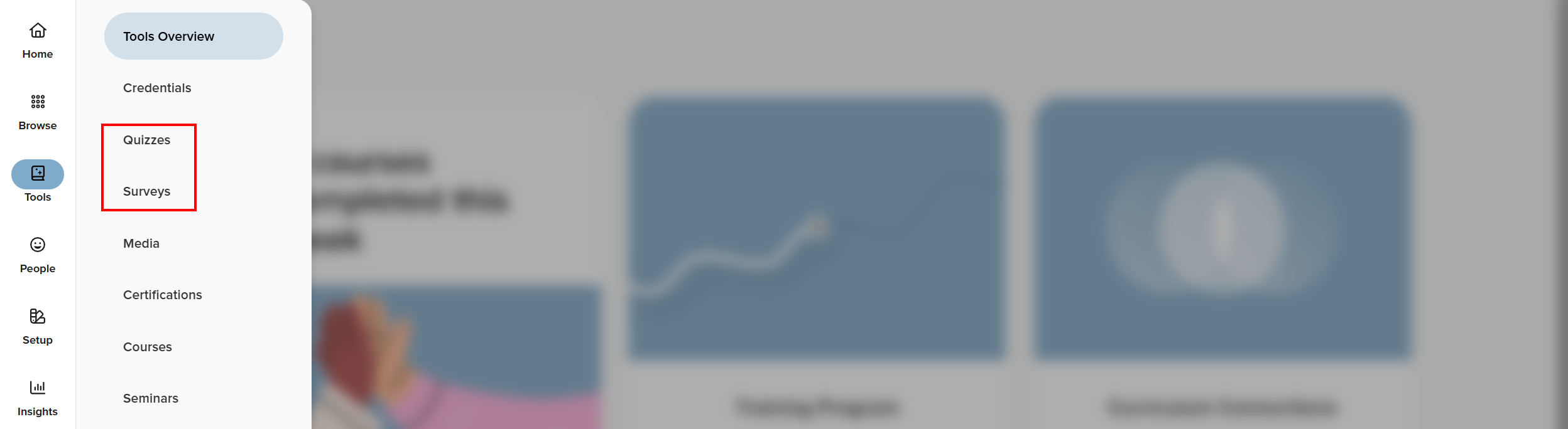 Permissions: Users must have access to the Tools menu and permission to create or edit Quizzes or Surveys.