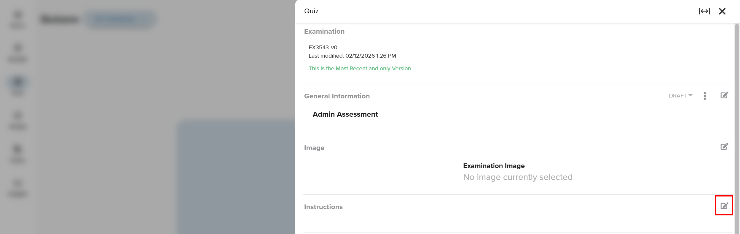- Click the Edit icon to open the instructions menu and add Instructions. These instructions are shown to students before they begin and appear alongside the Start or Retake options.