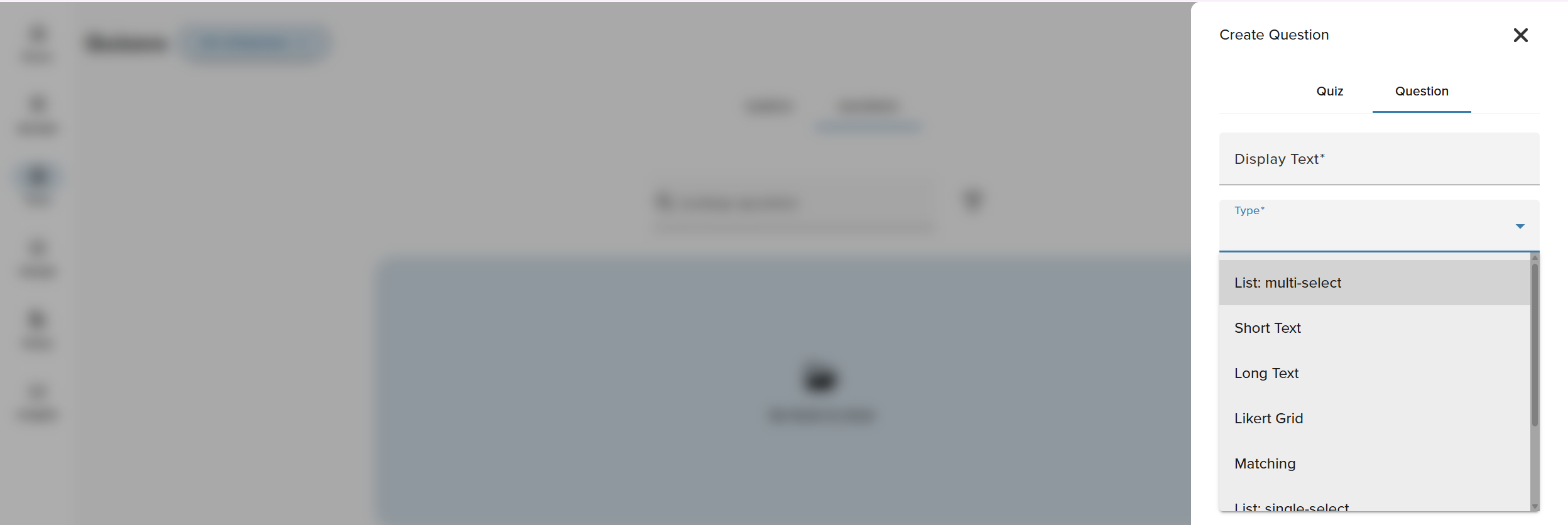 Question prerequisite: You must create and approve questions before adding them to a quiz or survey. New questions cannot be created during quiz or survey setup.